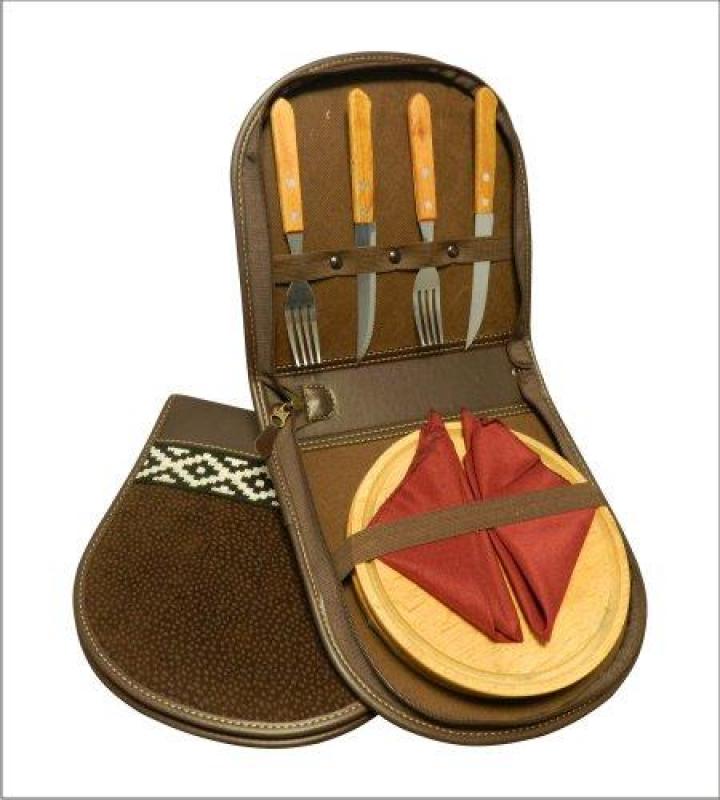 PICNIT SET, WOOD PLATE, FORK, KNIFE AND NAPKIN WITH IN SIMIL CAPYBARA SHEATH. For 2 People