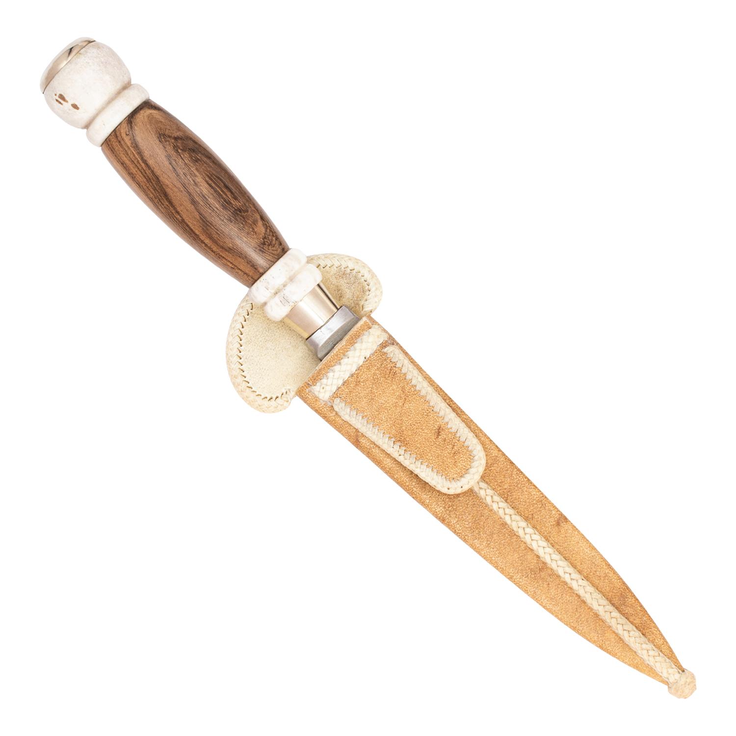 WOOD KNIFE WITH DESIGNS IN ANTLER AND SHEATH IN RAWHIDE